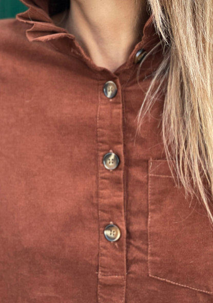Cette robe en jean à manches longues adopte une coupe droite élégante, rehaussée par un col ruché délicat et des boutons dorés raffinés.