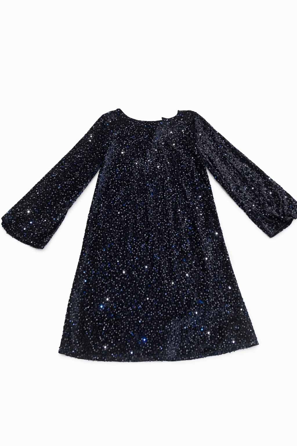 Laisse-toi séduire par cette robe noire intégralement ornée de sequins, parfaite pour briller lors de toutes tes soirées. Sa coupe fluide et légèrement évasée offre un tombé féminin et confortable, tandis que les manches longues apportent une touche chic en toute simplicité.