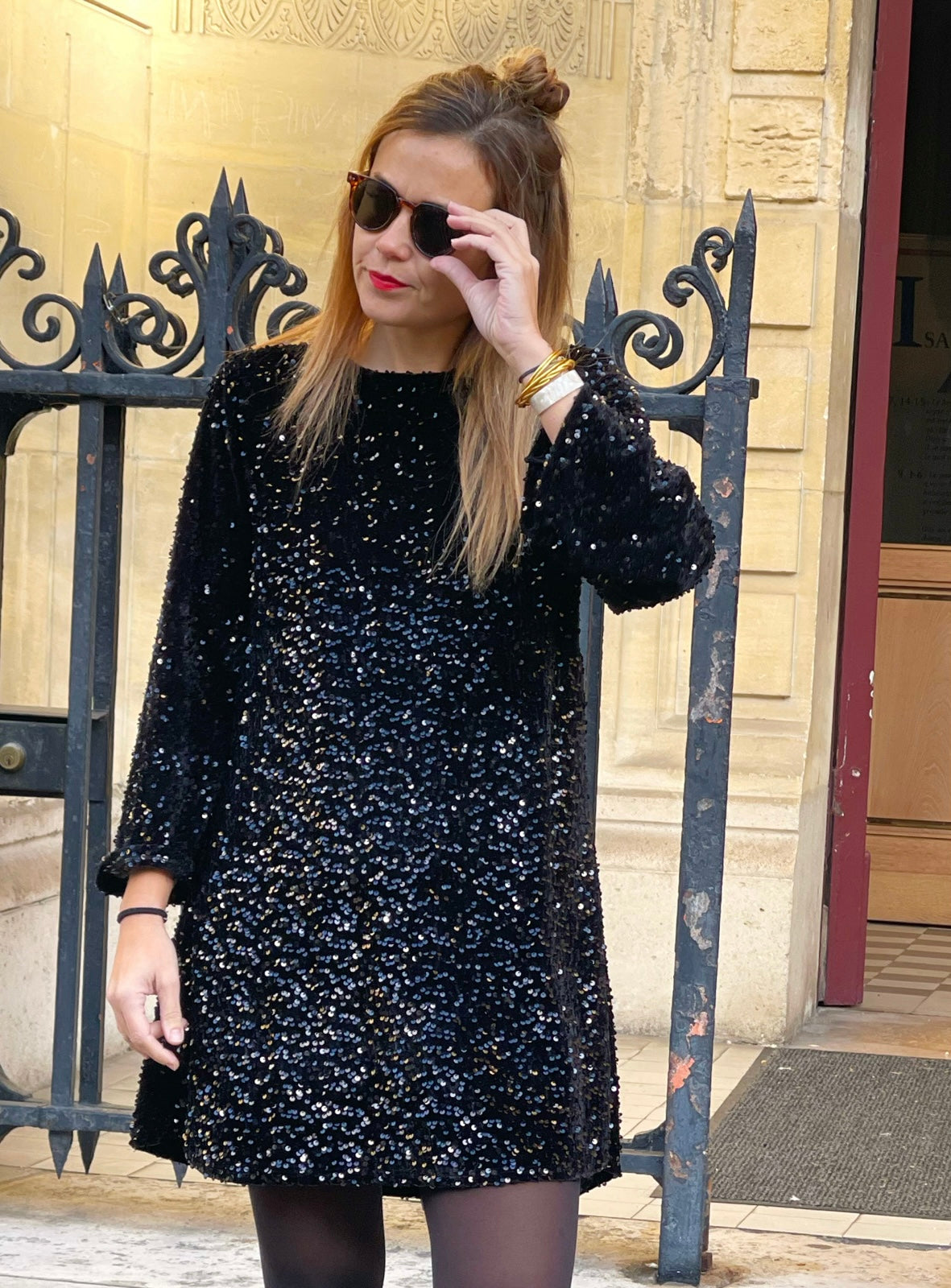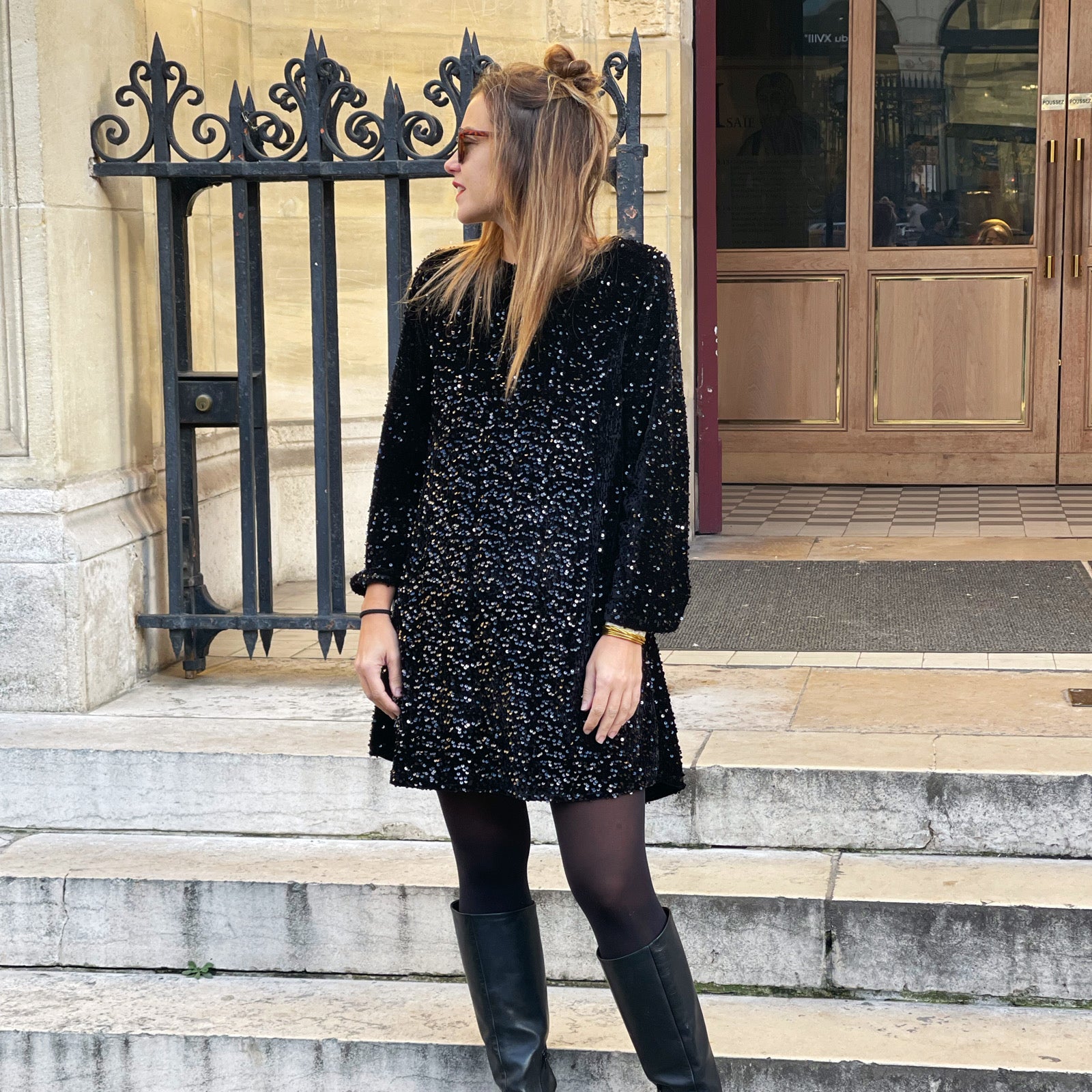 Le jeu de sequins capte la lumière à chaque mouvement, créant un effet scintillant subtil mais irrésistible. Associée à une paire d’escarpins ou à des bottines, elle devient la pièce maîtresse de ton look de fête.